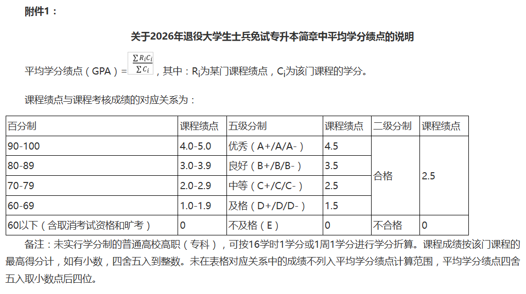 附件1:《关于2026年退役大学生士兵免试专升本简章中平均学分绩点的说明》